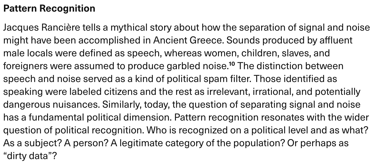 [13]: Steyerl, Hito. “A Sea of Data: Apophenia and Pattern (Mis-) Recognition.” E-Flux, April 2016.